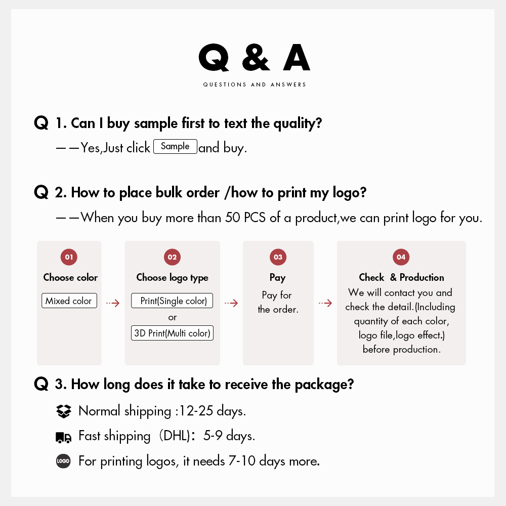 3. Nos pondremos en contacto con usted con los detalles de impresión del logotipo después de su pago en 24 horas durante nuestro tiempo de trabajo.